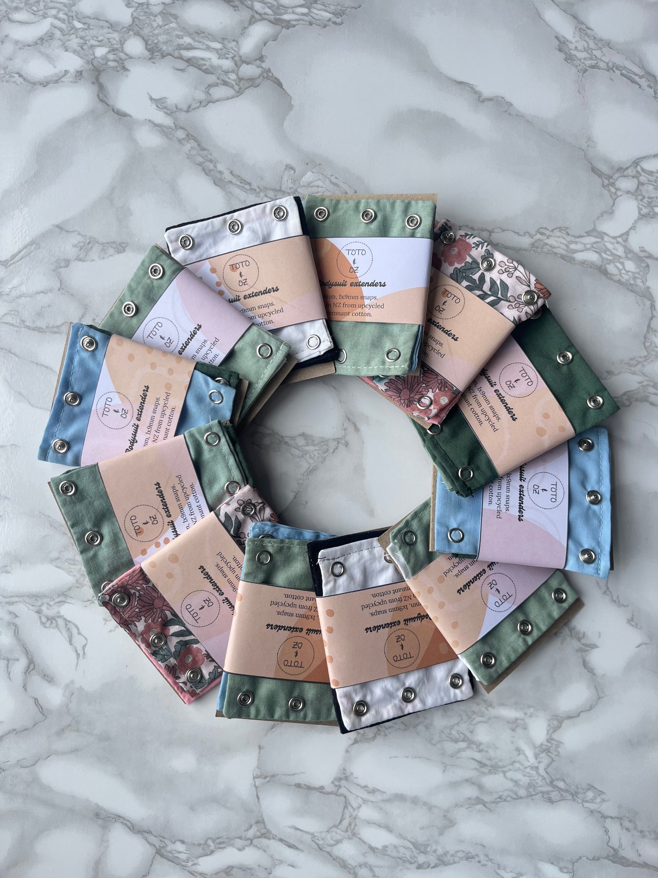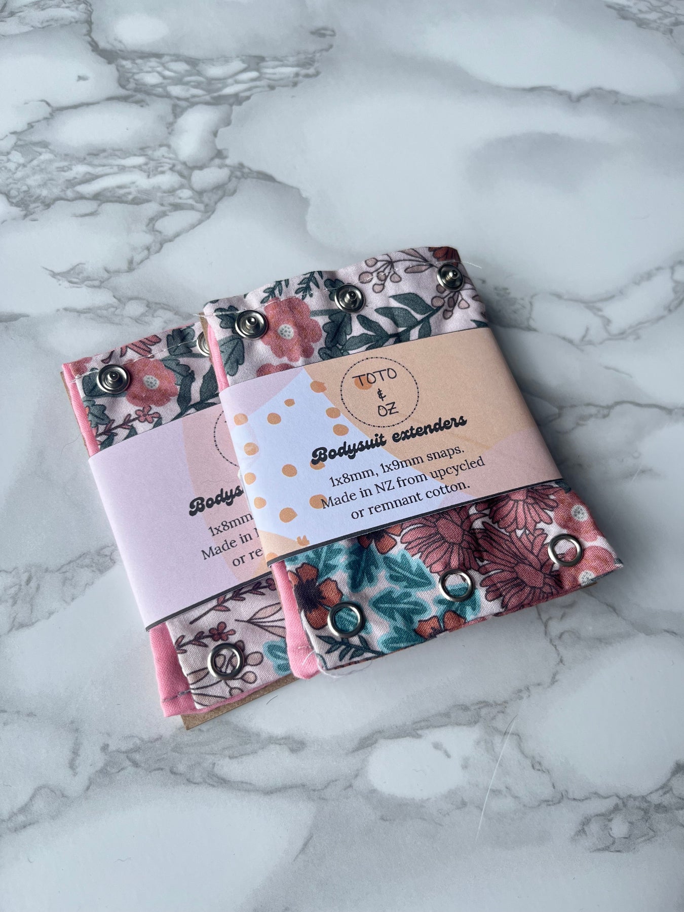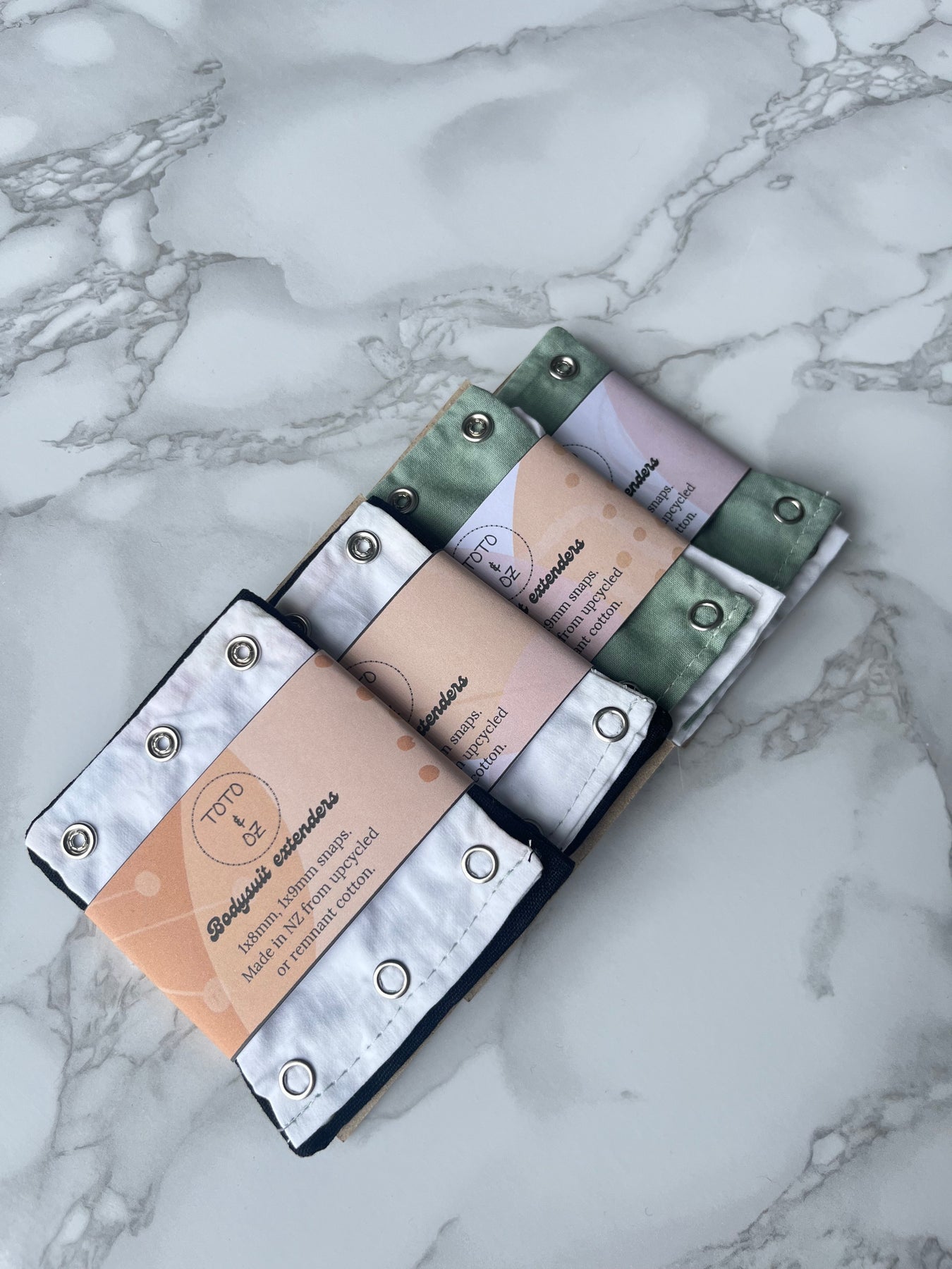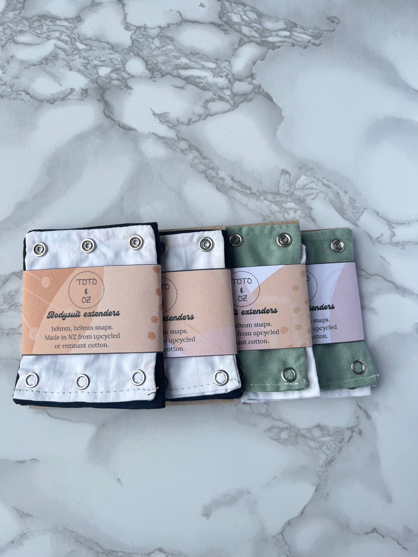 Upcycled cotton bodysuit extenders made with upcycled or remnant fabrics and quality snaps. Each set comes with 2 sizes, an 8mm and 9mm snap as different bodysuits have different snap sizes. Adds around 10cm length.