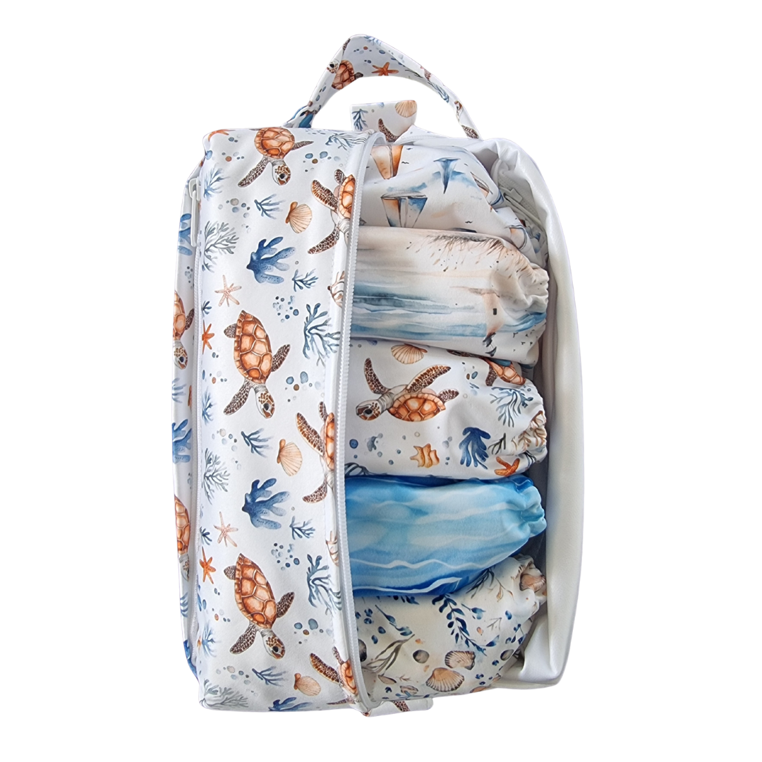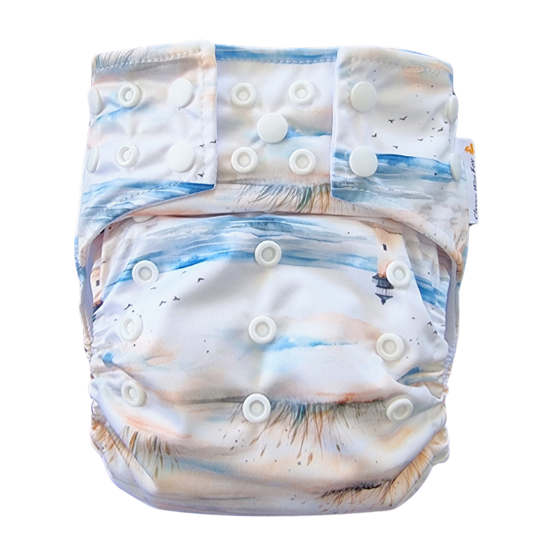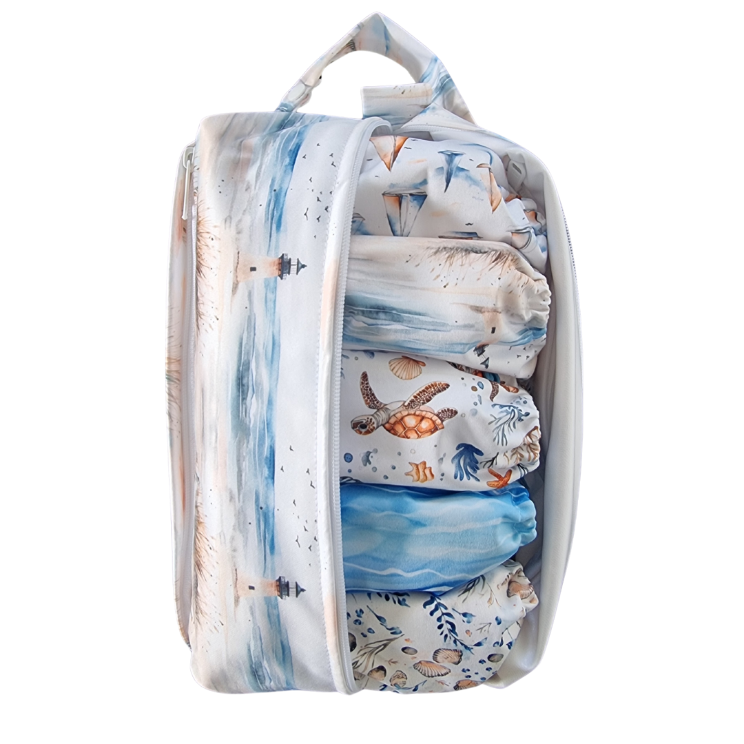 Includes 1 of each of the Shoreline Collection Nappies plus insert sets: Sailboats, Shoreline, Tide, Lighthouse & Turtles PLUS a FREE Pocket Pod in your choice of print.
