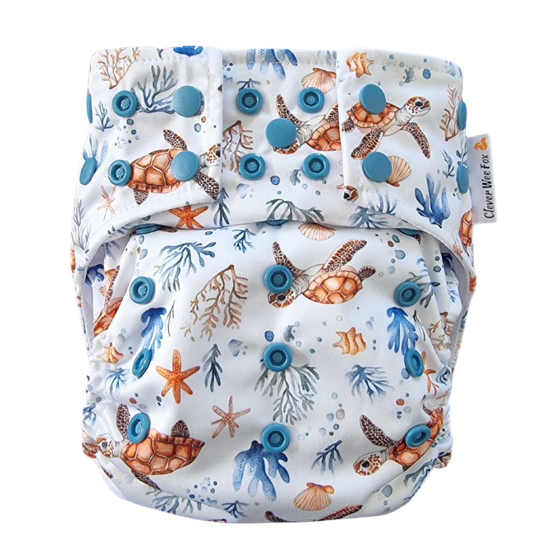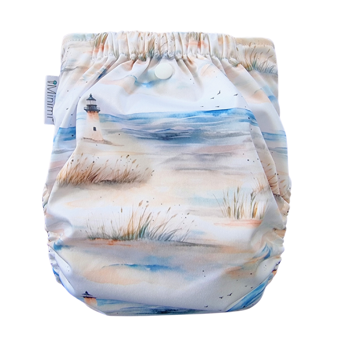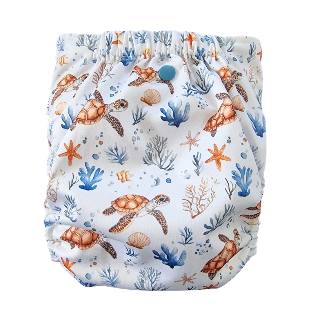 Includes 1 of each of the Shoreline Collection Nappies plus insert sets: Sailboats, Shoreline, Tide, Lighthouse & Turtles PLUS a FREE Pocket Pod in your choice of print.