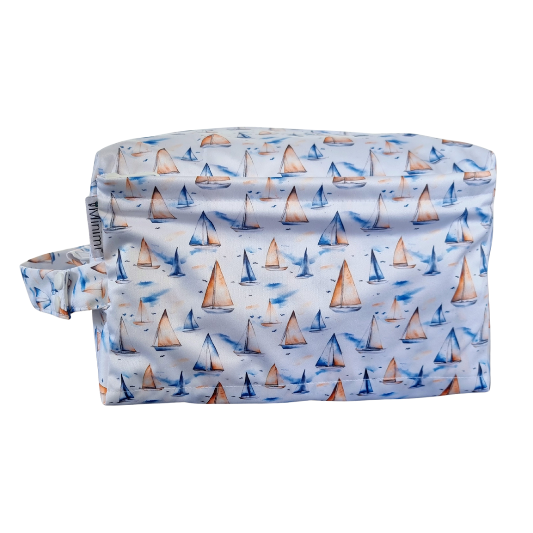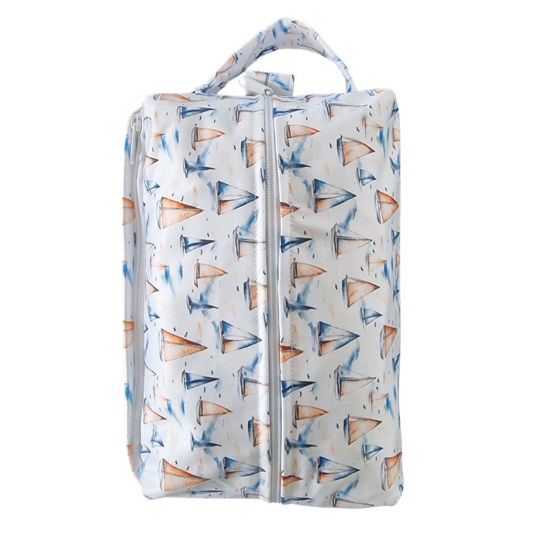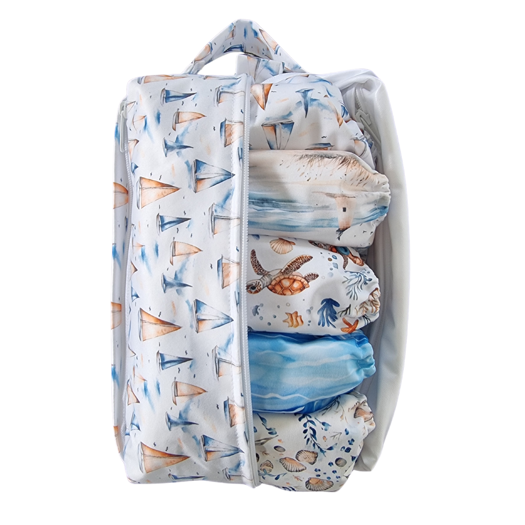 These handy nappy pods are essentially shaped wet bags, specifically designed to fit a stack of cloth nappies in - perfect for daycare or when you're out and about, but they also have many other uses such as toiletry bags, swim bags, much & more.