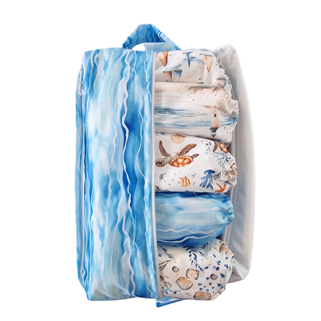 These handy nappy pods are essentially shaped wet bags, specifically designed to fit a stack of cloth nappies in - perfect for daycare or when you're out and about, but they also have many other uses such as toiletry bags, swim bags, much & more.